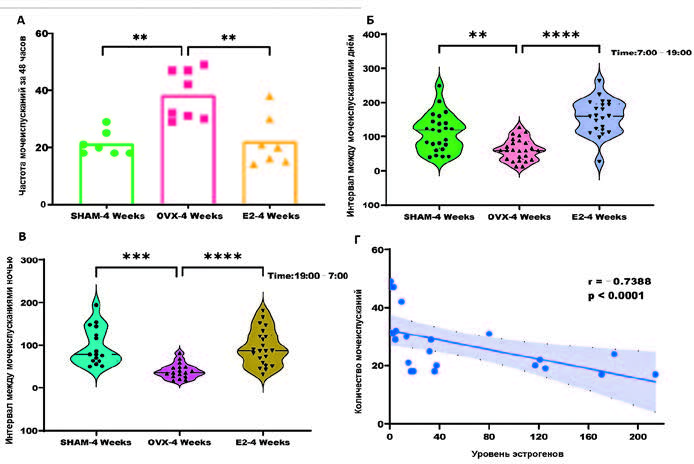Рис. 1. Изменения мочеиспускания в зависимости от уровня эстрогенов (SHAM-4 Weeks контрольная группа женских особей, OVX-4 Weeks – особи после оварэктомии, E2-4 Weeks – особи после оварэктомии на терапии эстрогеном): А – частота мочеиспусканий за 48 часов, Б – интервал между мочеиспусканиями днём, В – интервал между мочеиспусканиями ночью, Г – количество мочеиспусканий. Адаптировано из [15]