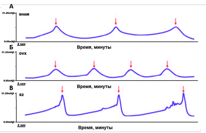 Рис. 2. Цистометрия у контрольной группы мышей (А), у женских особей после кастрации (Б), а также у особей, получающих эстрогены (В): показаны изменения внутрипузырного давления и сокращения мочевого пузыря (пики на графиках). Адаптировано из [15]