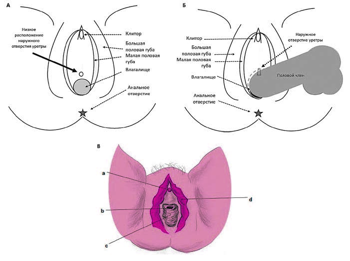 отверстие уретры, c – влагалище, d – малая половая губа, адаптировано из [4]