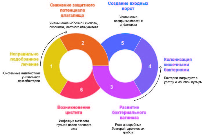 Следует отметить, что основным предрасполагающим фактором к возникновению бактериального вагиноза является прием системной антибактериальной терапии, которую, к сожалению, крайне часто назначают при остром цистите. Антибактериальные препараты широкого спектра действия, уничтожая патогенные бактериальные агенты, одновременно влияют и на микрофлору влагалища, снижая концентрацию лактобактерий и смещая микробиологическое равновесие в сторону дисбиоза с размножением факультативных и облигатных анаэробов и дрожжеподобных грибов. Тем самым, снижается защитный потенциал влагалища и кишечные и кожные бактерии колонизируют влагалище, преддверие влагалища, уретру, а затем и мочевой пузырь, способствуя развитию цистита после полового акта. Последние на фоне бактериального вагиноза зачастую болезненные и дискомфортные, что создает очаги микротравматизации влагалища, преддверия влагалища и уретры, еще более способствуя проникновению в мочевой пузырь уропатогенных бактерий. Таким образом, при неправильно подобранном лечении формируется порочный круг рецидивирования посткоитального цистита: на фоне системной антибактериальной терапии уничтожаются лактобактерии, снижается защитный потенциал влагалища, развивается бактериальный вагиноз с колонизацией кишечными бактериями уретры и мочевого пузыря, создаются входные ворота для инфекции и повторно после полового акта возникает цистит (рисунок 2).