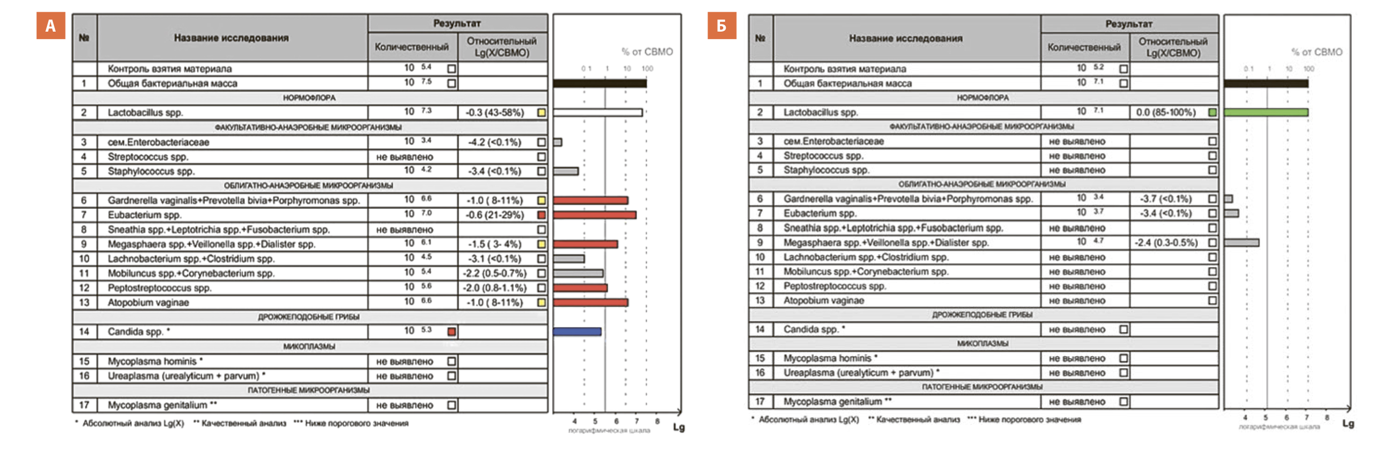 Рис. 3. Результаты Фемофлор-16 у пациентки Х. 23 лет: А – до лечения, Б – через 1 месяц после лечения.
