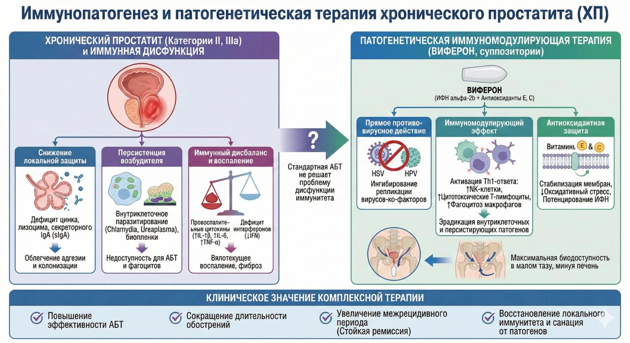 Включение ИМТ в схемы лечения ХП (особенно категорий II и IIIa, ассоциированных с урогенитальными инфекциями) позволяет повысить эффективность АБТ, сократить длительность обострений и, что наиболее важно, увеличить продолжительность межрецидивного периода. Терапия препаратами ИФН (Виферон) способствует восстановлению баланса в системе локального иммунитета, нормализации интерферонового статуса и санации от персистирующих патогенов, что является залогом стойкой ремиссии.