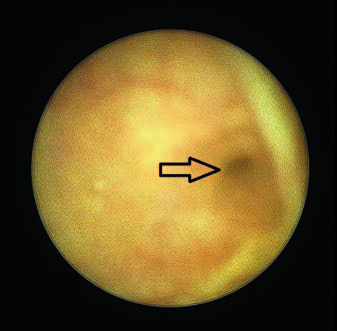 По данным видеоцистоскопии от 15.01.25 года: мочевой пузырь достаточного объема. По левой боковой стенке мочевого пузыря визуализируется дефект диаметром более 5 см. За данным дефектом определяется полость в виде дивертикула, объемом более 150 мл. В куполе данной полости отмечается артифициальное устье (рис. 3).