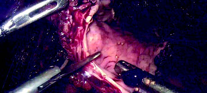Рассечен листок висцеральной брюшины над подвздошными сосудами слева. Ниже подвздошной артерии определяется расширенный контур левого мочеточника. Мочеточник выделен, резецирована избыточная ткань без отсечения от мочеточника в виде дивертикула (рис. 4). В мочеточник проведен стент-катетер. Дистальный конец стента погружен в мочевой пузырь. Выполнена тубуляризация мочеточника на стент-катетере. В малый таз установлен дренаж. Контроль гемостаза.