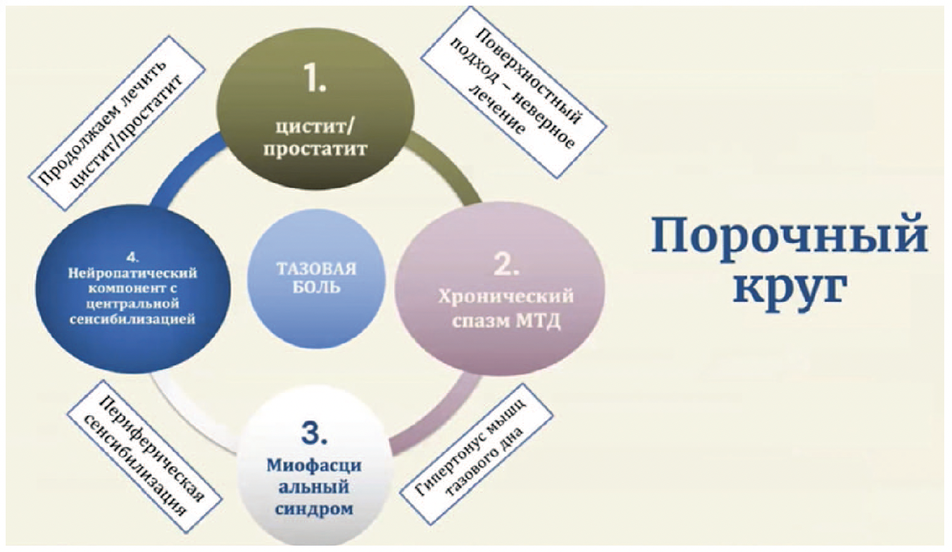 Таким образом, формируется порочный круг, характерный для синдрома хронической тазовой боли: пациент жалуется на боль в области малого таза, ему ставится диагноз простатит или цистит, проводят поверхностное обследование и назначают неверное лечение. Так как лечение не эффективно и боль продолжает беспокоить пациента, формируется хронический спазм мышц тазового дна – внутренней запирательной мышцы, мышц леваторов, у мужчин – бульбоспонгиозной мышцы. Затем формируется миалгия напряжения, возникает миофасциальный болевой синдром.