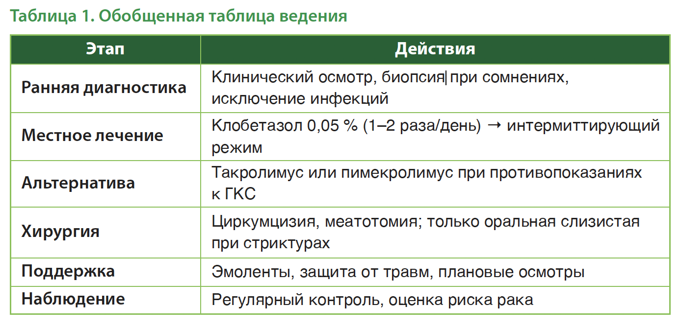 Клобетазол пропионат 0,05% – препарат выбора, эффективно подавляет симптомы и замедляет прогрессирование заболевания. Рекомендуется наносить 1–2 раза в день в течение 2–3 месяцев, затем перейти на поддерживающий режим (auau.auanet.org).