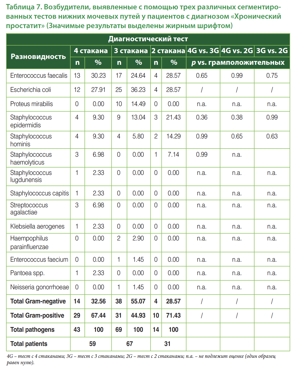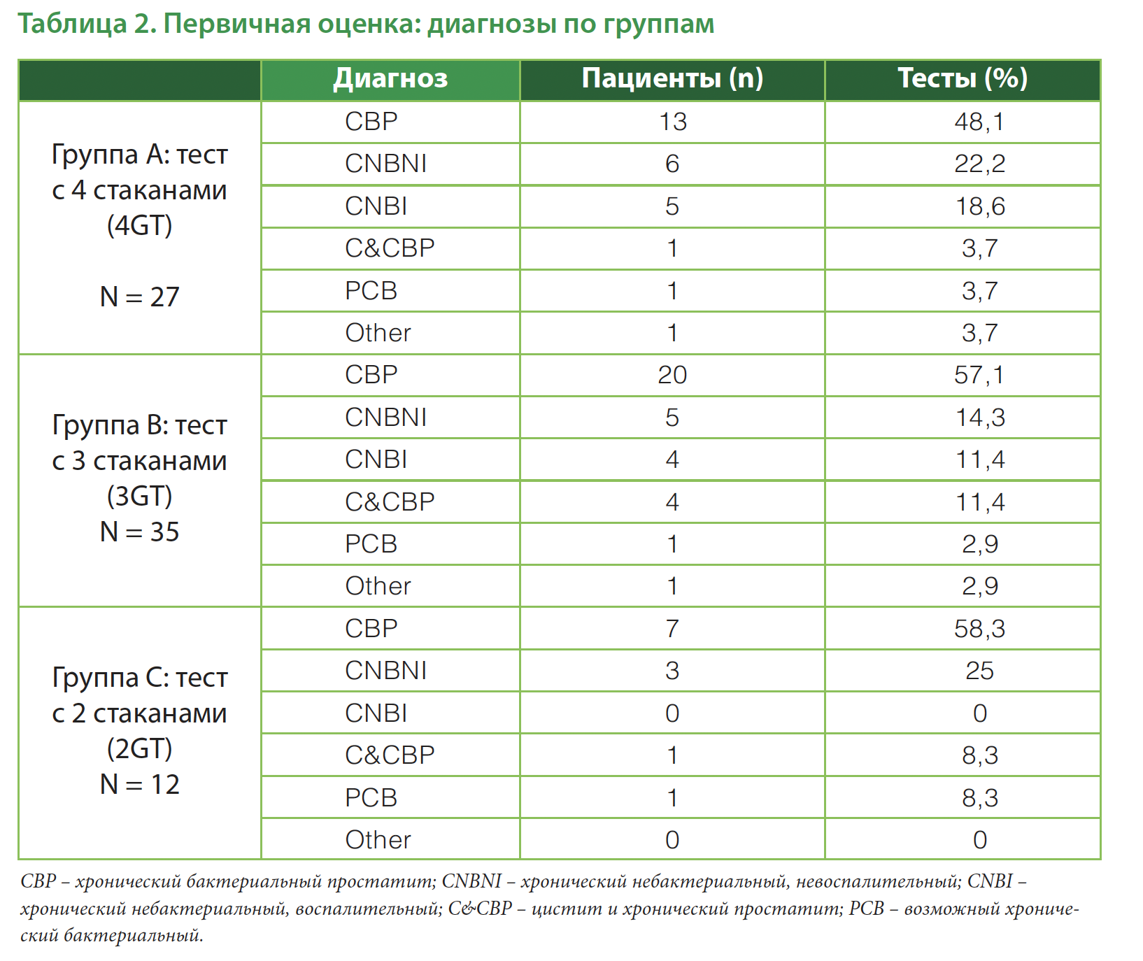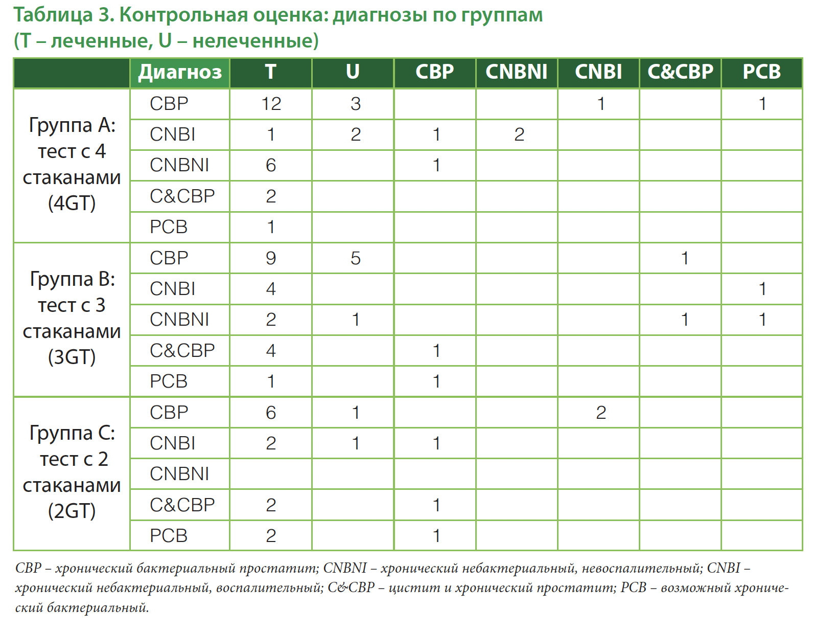 Сравнение трех диагностических тестов показало, что тест с посевом всего эякулята (3-стаканная проба) эквивалентен тестам, основанным на посеве секрета предстательной железы. Однако добавление исследования всего эякулята к 4-стаканной или 2-стаканной пробам может повысить их диагностическую точность.