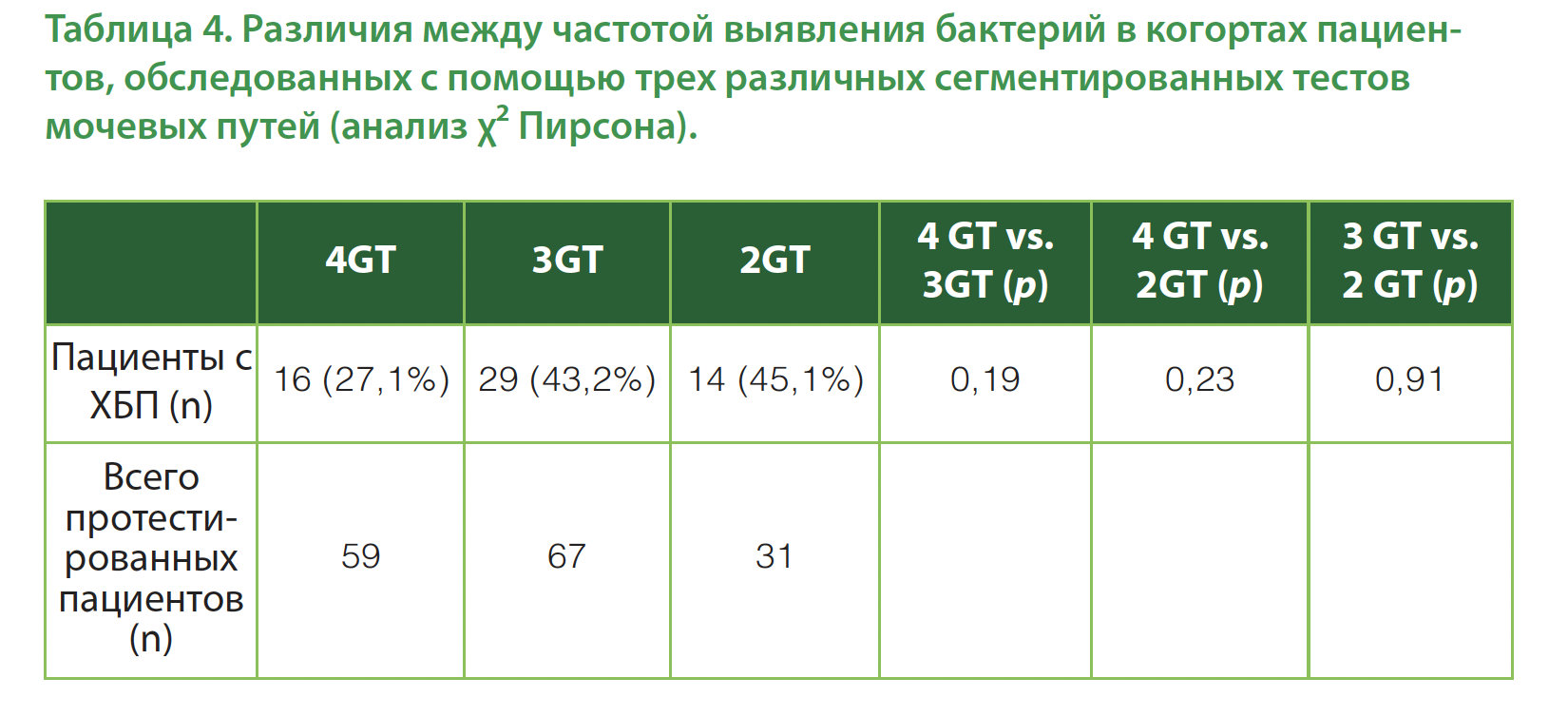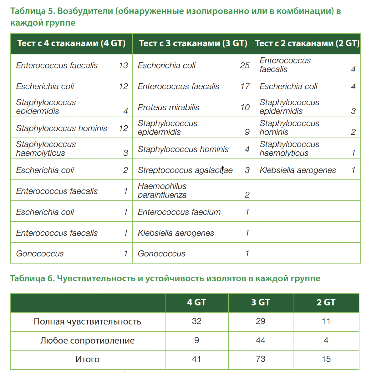 - 3-стаканная проба выявляет значительно больше грамотрицательных патогенов по сравнению как с 4GT (p = 0,014), так и с 2GT (p = 0,005).