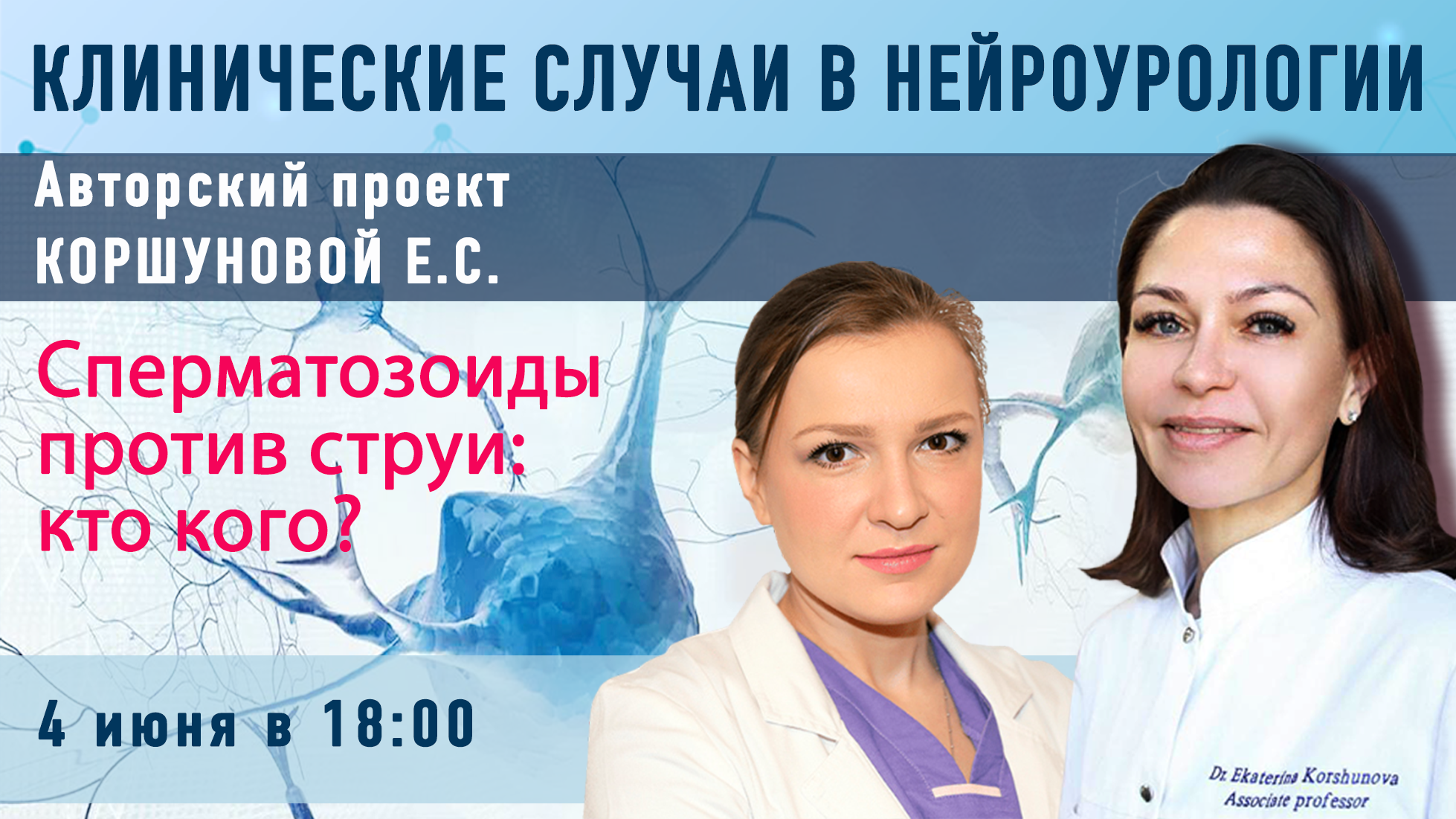 Приглашаем присоединиться к трансляции вебинара Клинические случаи в нейроурологии на тему «Клинические случаи в нейроурологии. Сперматозоиды против струи: кто кого?», который состоится 4 июня в 18.00 по московскому времени.