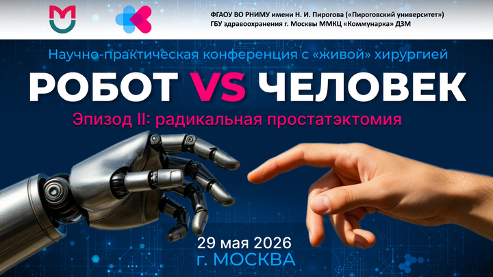 Приглашаем Вас принять участие в Научно-практической конференции с «живой» хирургией «Робот vs Человек. Эпизод 2: радикальная простатэктомия», которая пройдет 29 мая 2026 года в городе Москва.