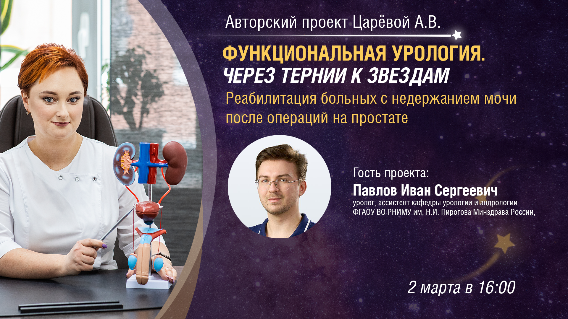 Приглашаем присоединиться к трансляции пятого выпуска авторского проекта Царёвой А.В. «Функциональная урология. Через тернии к звездам» на тему «Реабилитация больных с недержанием мочи после операций на простате», которая состоится 2 марта в 16:00 по московскому времени.