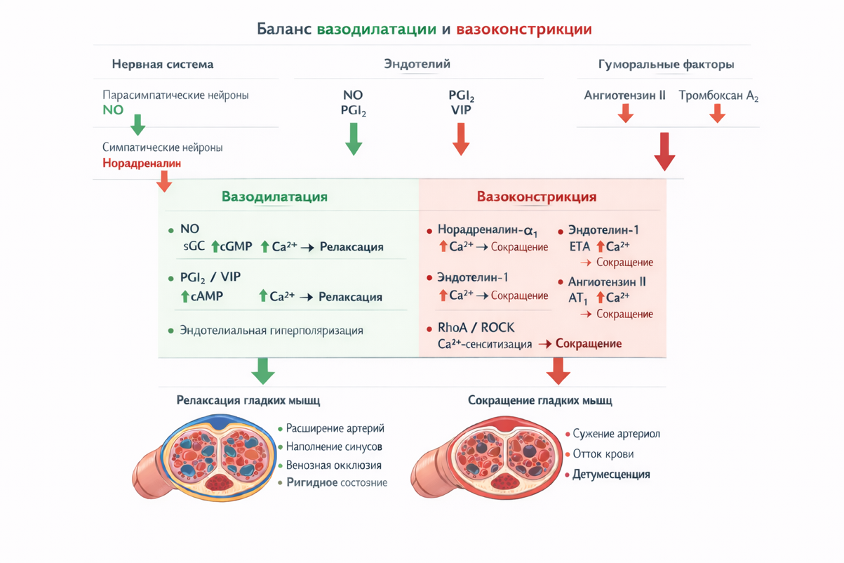 Нарушение соотношения вазодилататоров и вазоконстрикторов лежит в основе большинства форм эректильной дисфункции. Снижение биодоступности NO при эндотелиальной дисфункции, усиление симпатического тонуса, активация RhoA/ROCK-пути или структурная перестройка кавернозной ткани (фиброз, снижение эластичности) приводят к преобладанию вазоконстрикции и невозможности адекватной релаксации гладких мышц.