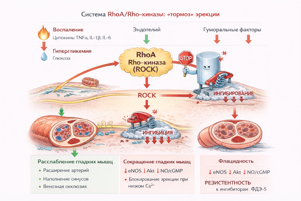 Современные исследования (2023–2024 гг.) подтверждают важнейшую роль сигнального пути RhoA/Rho-киназы (ROCK) в поддержании состояния детумесценции и развитии ЭД [7]. Активация ROCK под действием провоспалительных цитокинов или гипергликемии приводит к ингибированию фосфатазы легких цепей миозина (MLCP) [17]. Это поддерживает гладкомышечные клетки в состоянии сокращения даже при низких уровнях кальция, блокируя возможность эрекции (рис. 3).