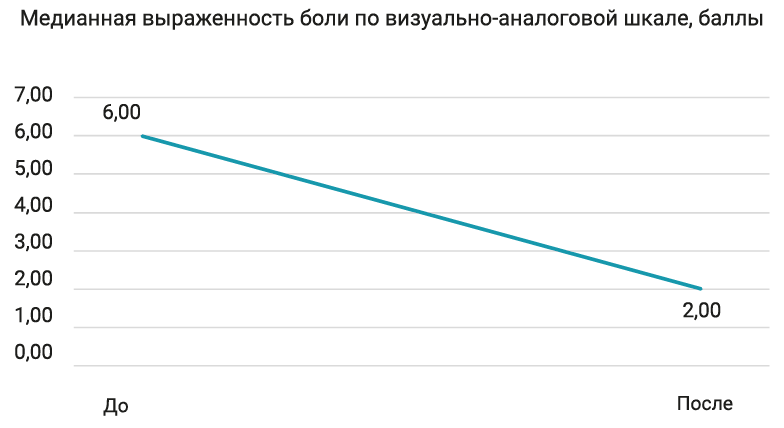 Результаты. На фоне полугодовой терапии изучаемым препаратом, медианная выраженность боли по визуально-аналоговой шкале (ВАШ) снизилась в 3 раза с 6 баллов до 2 (р<0,05).