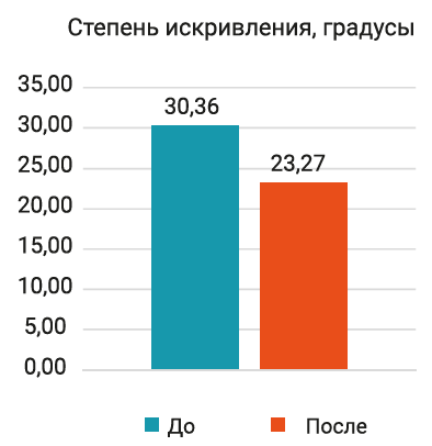 Степень искривления снизилась на 23%: с 30,36 до 23,27 градусов (р<0,05).