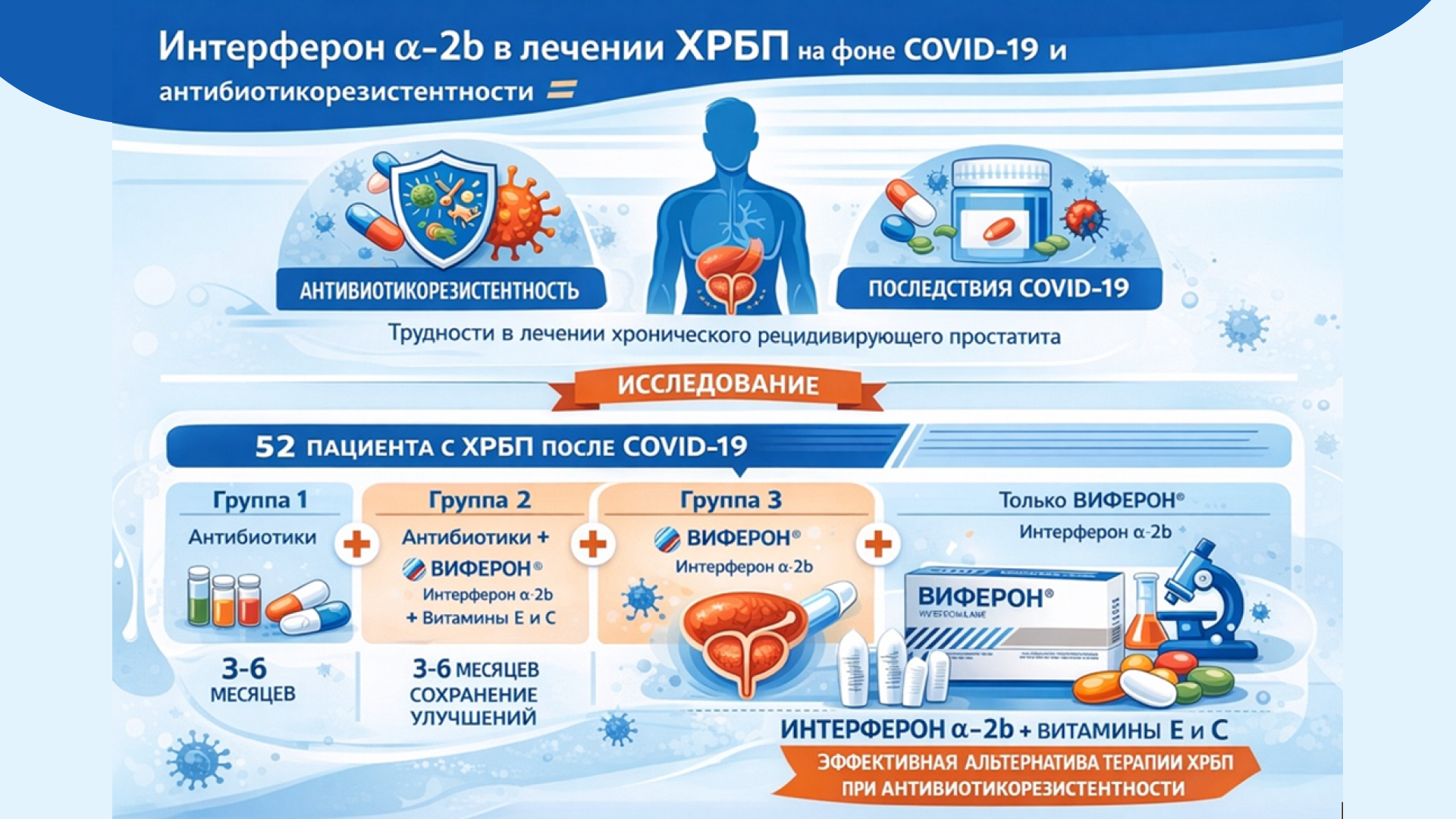 На этом фоне интерес представляет российское исследование, посвящённое оценке эффективности рекомбинантного интерферона α-2b у пациентов с ХРБП, перенесших COVID-19. Авторы проанализировали результаты лечения 52 пациентов с верифицированной множественной антибиотикорезистентностью микроорганизмов, выявленных в секрете предстательной железы.