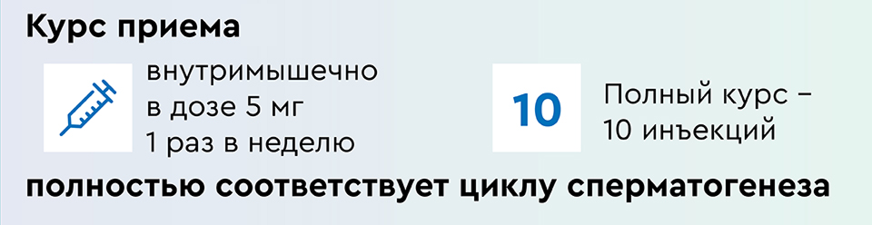 - При недостаточности репродуктивной функции с целью увеличения числа и подвижности сперматозоидов и повышения вероятности зачатия естественным путем в качестве эмпирической терапии рекомендовано рассмотреть возможность внутримышечного курсового введения полипептидов семенников крупного рогатого скота в дозировке 5 мг 1 раз в неделю 10 недель