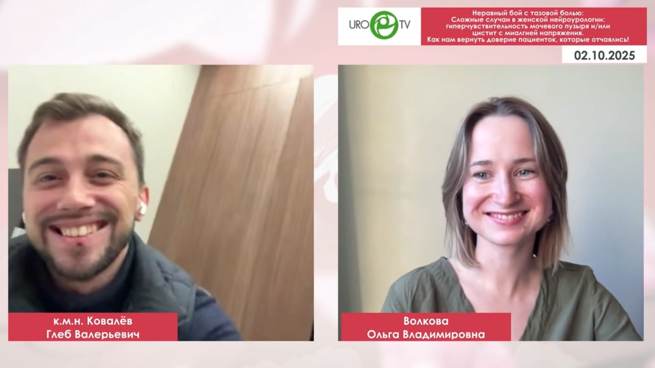 Опубликована видеозапись трансляции нового выпуска авторского проекта Неравный бой с тазовой болью с Ковалевым Г.В. на тему «Сложные случаи в женской нейроурологии: гиперчувствительность мочевого пузыря и/или цистит с миалгией напряжения. Как нам вернуть доверие пациенток, которые отчаялись!», которая проходила 2 октября 2025 года на сайте Uro.TV.