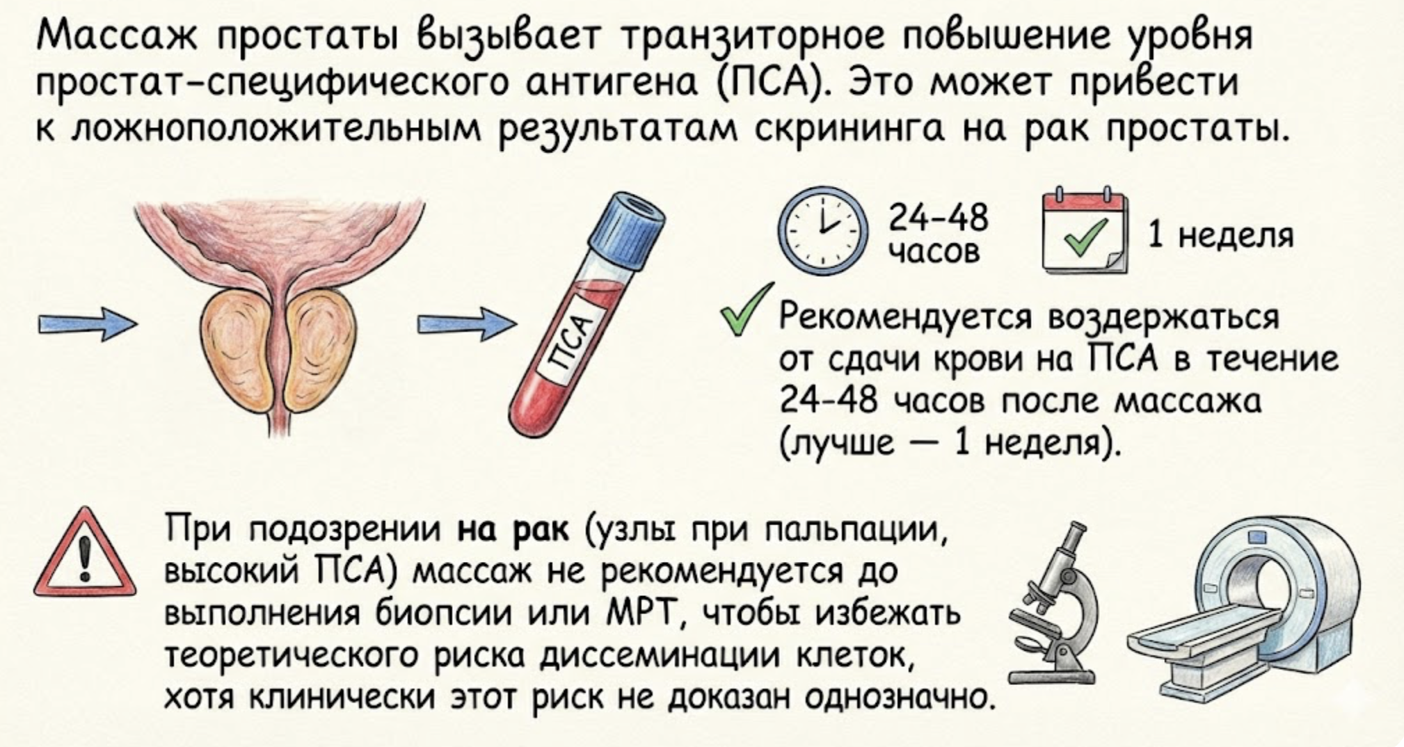 Массаж простаты вызывает транзиторное повышение уровня простат-специфического антигена (ПСА) (рис. 2). Это может привести к ложноположительным результатам скрининга на рак простаты. Рекомендуется воздержаться от сдачи крови на ПСА в течение 24-48 часов после массажа (лучше — 1 неделя). При подозрении на рак (узлы при пальпации, высокий ПСА) массаж не рекомендуется до выполнения биопсии или МРТ, чтобы избежать теоретического риска диссеминации клеток, хотя клинически этот риск не доказан однозначно [30].