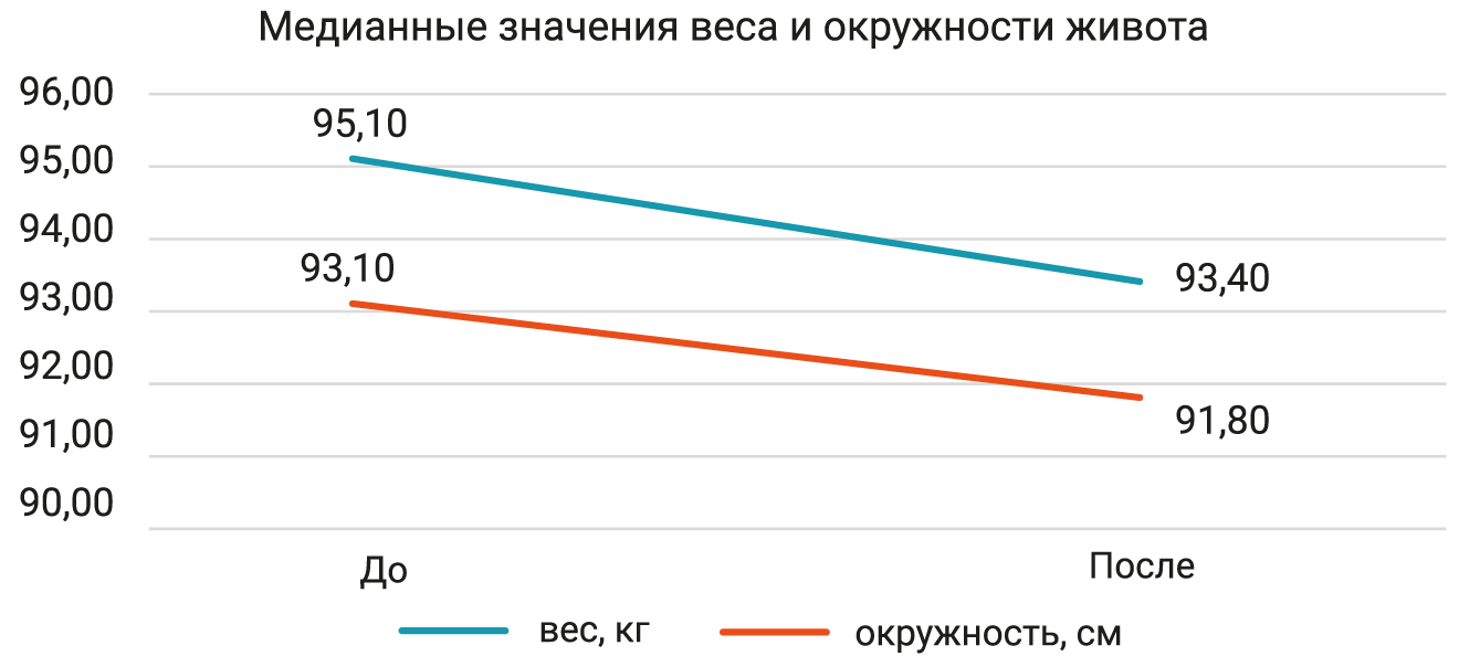 Медианные значения веса и окружности живота уменьшились: с 95,1 кг до 93,4 кг (р˂0,05) и с 93,1 см до 91,8 см (р˂0,05) соответственно.