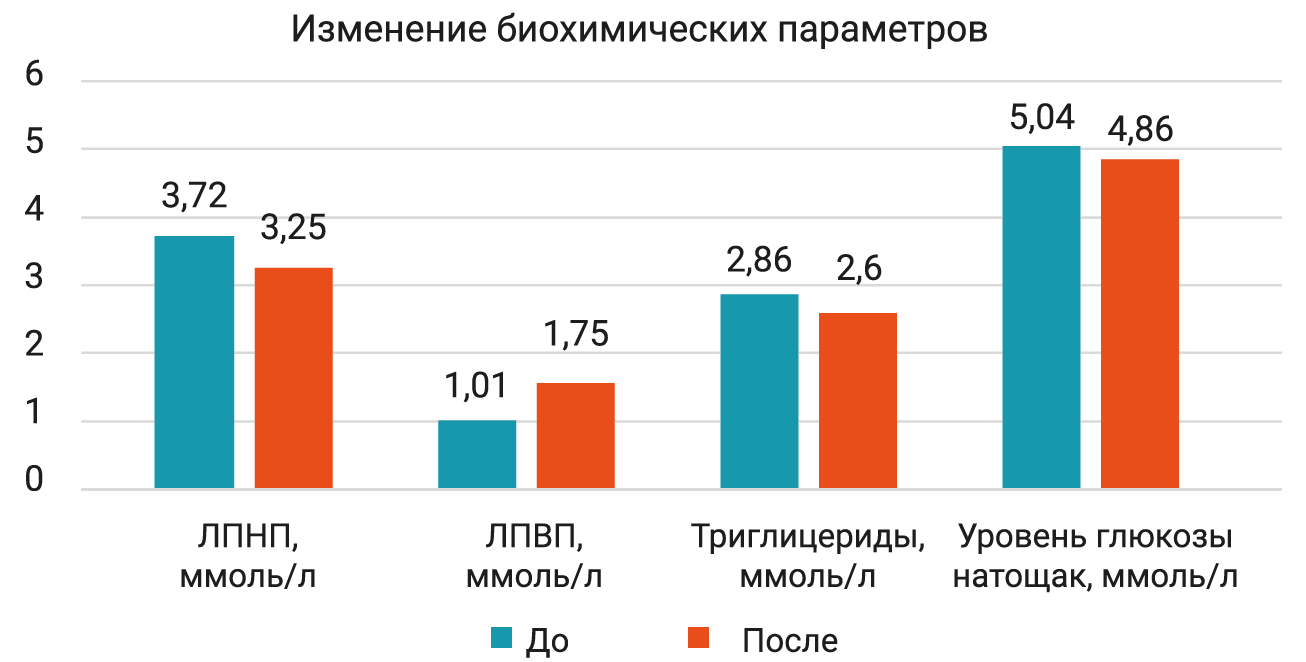 Артериальное давление в среднем снизилось с 136/86 мм.рт.ст. до 129/82 мм.рт.ст. (р˂0,05), уровень общего холестерина снизился на 9% с 5,46 ммоль/л до 5,02 ммоль/л (р˂0,05), ЛПНП снизились с 3,72 ммоль/л до 3,25 ммоль/л (р˂0,05), ЛПВП повысились в пределах нормы с 1,01 ммоль/л до 1,55 ммоль/л (р=0,027), триглицериды снизились с 2,86 ммоль/л до 2,6 ммоль/л (р˂0,05), уровень глюкозы натощак снизился с 5,04 ммоль/л до 4,86 ммоль/л.