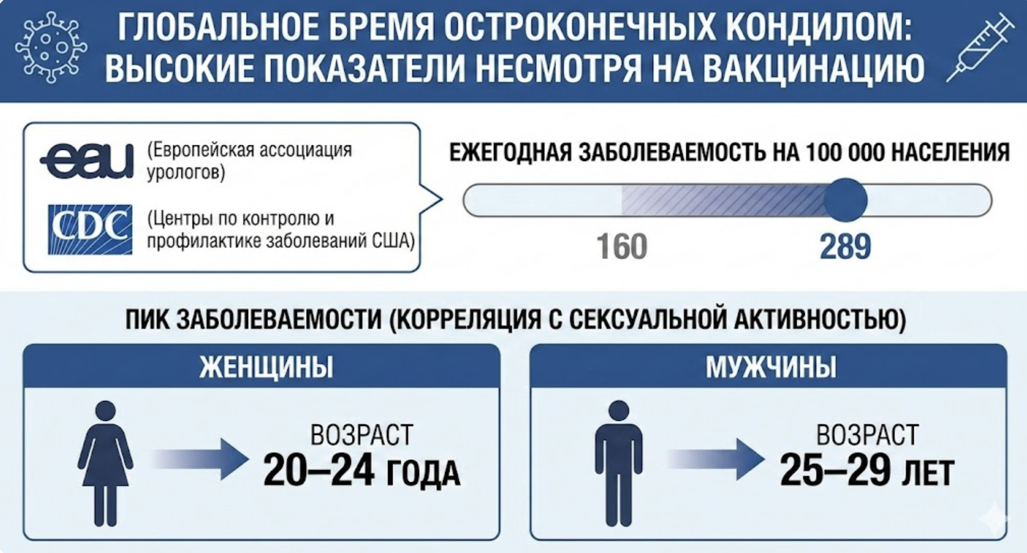 Глобальное бремя заболевания остроконечными кондиломами остается высоким, несмотря на внедрение программ вакцинации [2-5]. Согласно данным Европейской ассоциации урологов (EAU) и Центров по контролю и профилактике заболеваний США (CDC), ежегодная заболеваемость аногенитальными бородавками варьирует в широких пределах — от 160 до 289 случаев на 100 000 населения [2, 3]. Пик заболеваемости предсказуемо коррелирует с пиком сексуальной активности и приходится на возрастную когорту 20–24 года у женщин и 25–29 лет у мужчин.