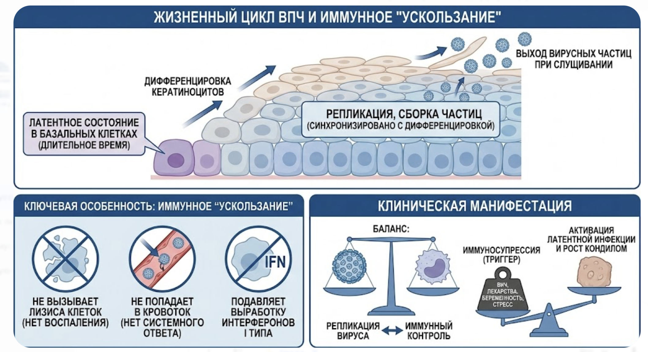 Ключевой особенностью ВПЧ является его способность «ускользать» от иммунного надзора. Вирус не вызывает лизиса клеток (нет воспаления), не попадает в кровоток (нет системного иммунного ответа) и подавляет выработку интерферонов первого типа в зараженных клетках. Это объясняет, почему инфекция может персистировать месяцами и годами без клинических проявлений.