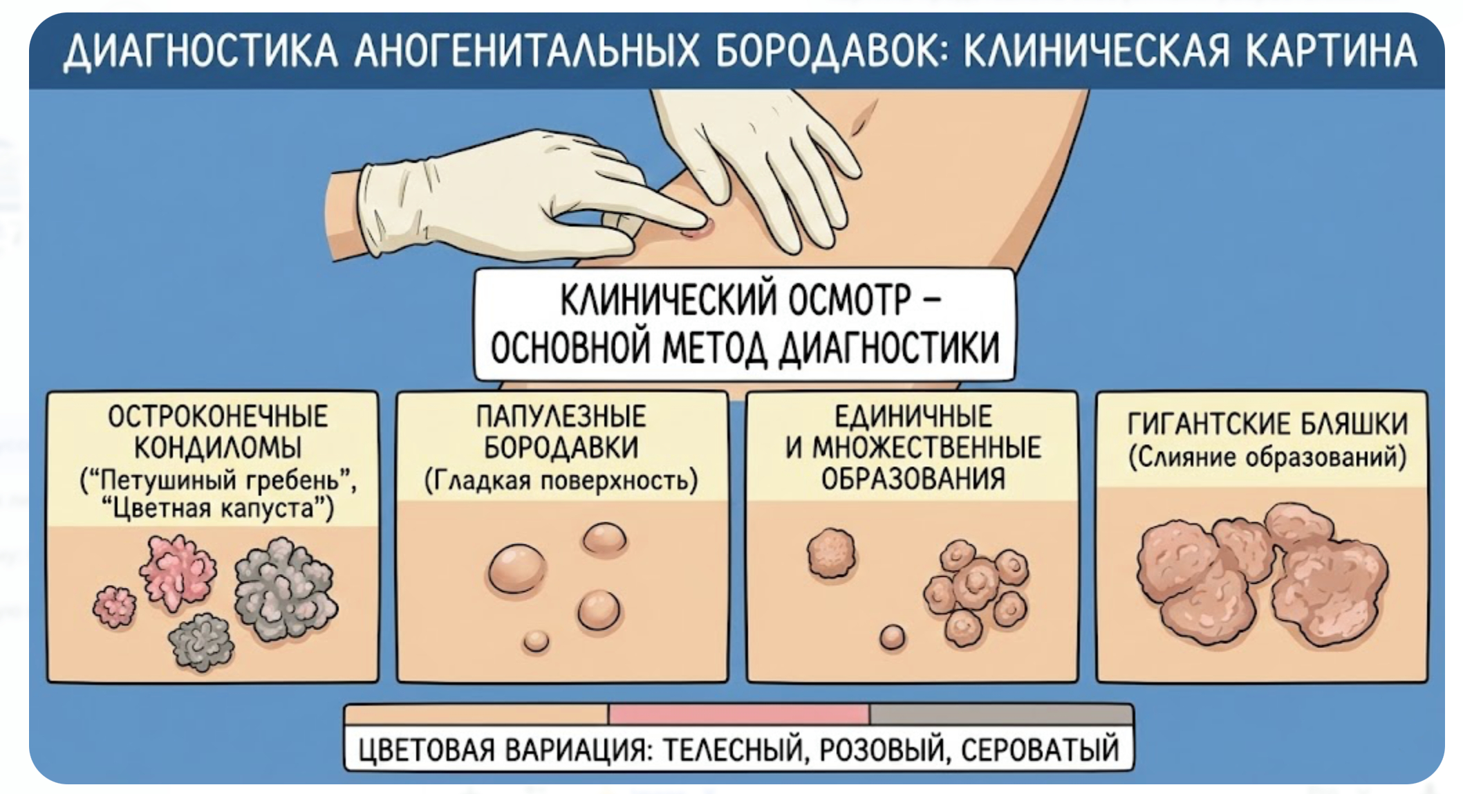 Рис. 2. Диагностика и внешний вид аногенитальных бородавок
