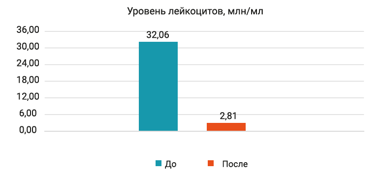 Уровень лейкоцитов снизился на 92% с 32,06 до 2,81 (р<0,05), уровень бактерий в среднем снизился в два раза (р<0,05).