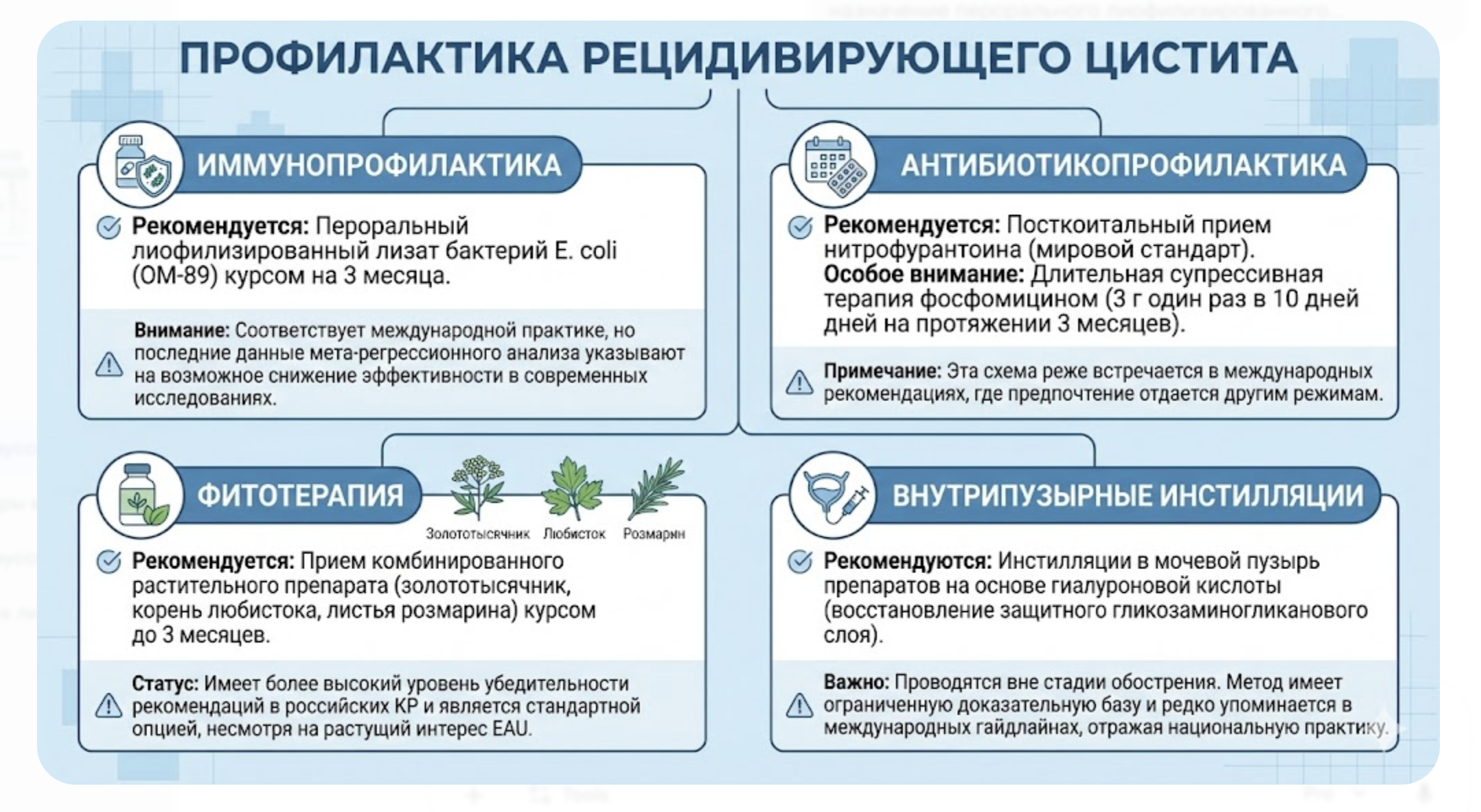 - Неантибактериальная профилактика. Растет роль методов с доказанной эффективностью, таких как вагинальная эстрогенотерапия в постменопаузе и адекватная гидратация. Одновременно происходит переоценка и разочарование в ранее популярных опциях: высококачественные РКИ не подтвердили эффективность D-маннозы, а последние метаанализы ставят под сомнение долгосрочную надежность иммунопрофилактики OM-89.