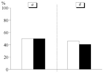 Количество пациентов с легкой степенью выраженности СНМП (IPSS < 8 баллов;а) и незначительными нарушениями мочеиспускания (Qmax > 15 мл/сек;б) в исследуемых группах через 16 недель лечения. Светлые столбики - афала, темные - S. Repens