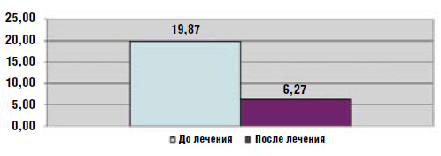 При оценке эректильной функции по шкале МКФ до лечения выявлено некоторое снижение мужской копулятивной функции. Максимальная среднестатистическая сумма баллов была несколько ниже максимальной суммы баллов в данной возрастной категории больных (максимальная среднестатистическая сумма баллов 19,87 ± 7,56; среднестатистический возраст 62,40 ± 8,91 года). На фоне комплексного лечения препаратом Аводарт в сочетании с препаратом Импаза ухудшения эректильной функции отмечено не было, а наоборот, выявлено увеличение суммарного балла до 24,27 ± 7,58 (р = 0,002) (рис. 5).