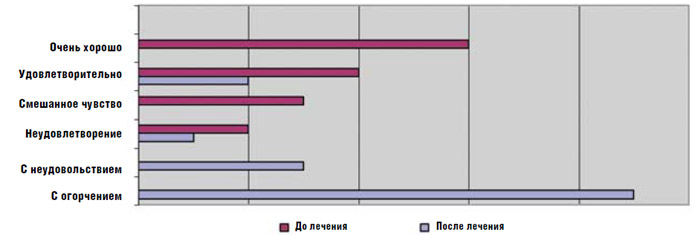 И действительно, произошло снижение индекса QoL (Индекс качества жизни) с 5,13 ± 1,41 до 2,07 ± 1,10 (р = 0,001) (рис. 2). До лечения 56,25% пациентов отвечали на опросник QoL «с огорчением», 18,75% — «с недовольством», 6,25% — «неудовлетворительно» и только 12,5% «удовлетворительно»; после лечения динамика распределения ответов иная: 12,5% ответили «неудовлетворительно», 18,75% — «смешанное чувство», 25% — «удовлетворительно» и 375% — «хорошо» (рис. 3).
