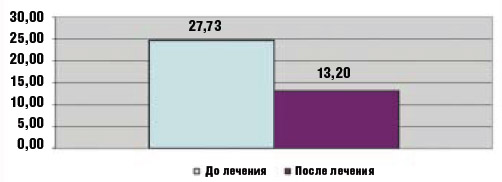 Зарегистрировано статистически достоверное снижение уровня беспокойства по опроснику DAN-PSS (the Danish Prostatic Symptom Score) с 24,73 ± 15,00 до 13,20 ± 7,74 балла (p = 0,01) (рис. 4).