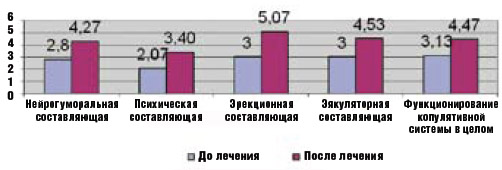 При оценке отдельных составляющих копулятивного цикла видим, что показатели до лечения соответственно находятся ниже допустимых возрастных норм. После комплексного лечения отмечается некоторое увеличение данных показателей, причем более значимо улучшается эрекционная составляющая МКФ (рис. 6).