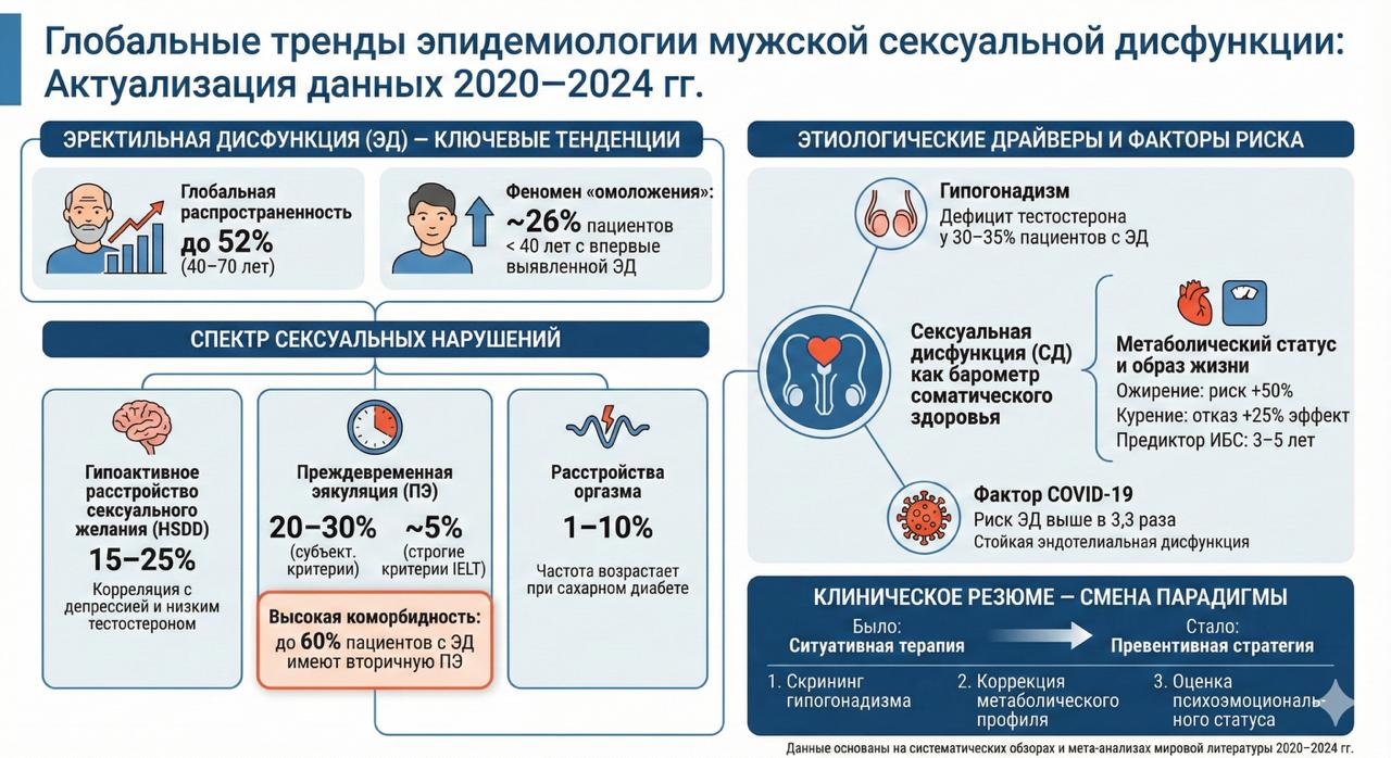 Анализ мировой литературы за последние пять лет демонстрирует не только рост распространенности эректильной дисфункции (ЭД), но и значительное увеличение частоты расстройств либидо и оргазма, тесно ассоциированных с метаболическими и психосоциальными факторами.