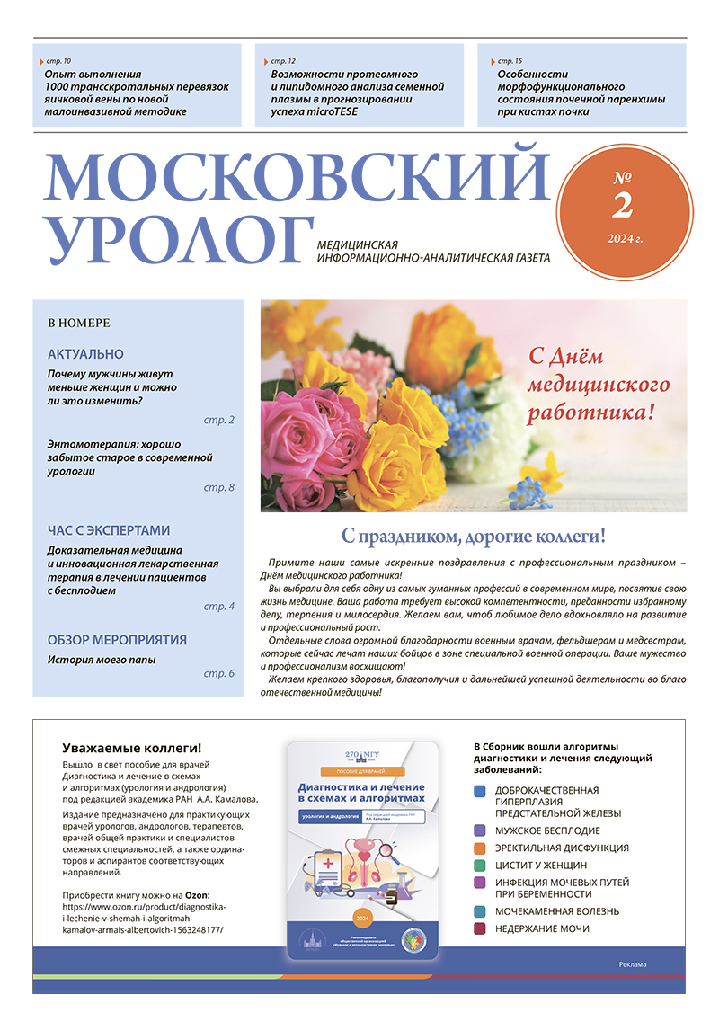 Варикоцеле представляет собой состояние, характеризующееся варикозным расширением вен лозовидного сплетения семенного канатика, сопровождающееся ретроградным венозным кровотоком [1]. Первые упоминания о варикоцеле датируются I веком нашей эры, когда древнеримский ученый Авл Корнелий Цельс впервые описал это заболевание и связал расширение вен гроздевидного сплетения с ипсилатеральной атрофией яичка. С тех пор варикоцеле остается актуальной проблемой [2, 3]. Это также является наиболее распространенной причиной мужской бесплодия [4–6]. Частота встречаемости варикоцеле в общей популяции составляет примерно 15%, при этом выявляется у 19–41% мужчин с первичным бесплодием и 45–81% мужчин с вторичным бесплодием [7].