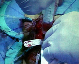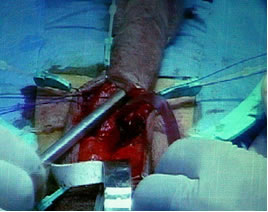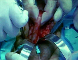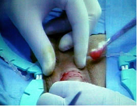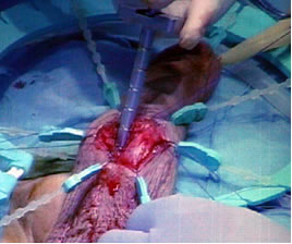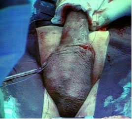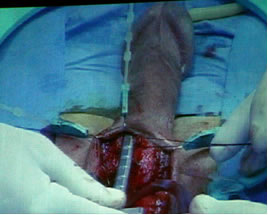 стенка кавернозного тела рассечена скальпелем. Разрез расширен
