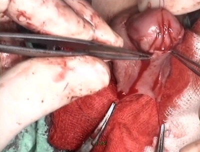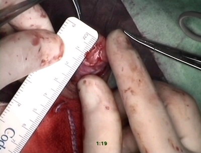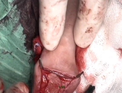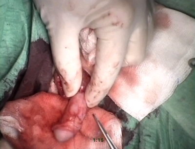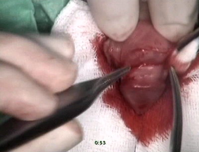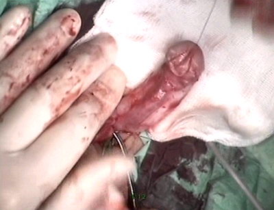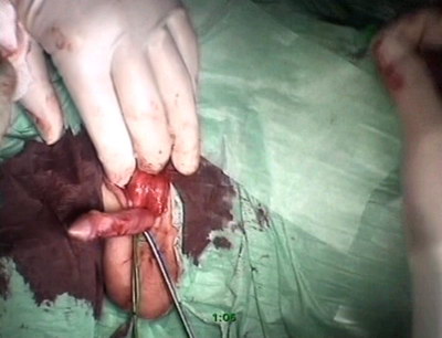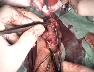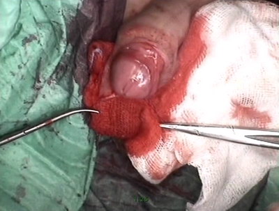 разрёз под гипоспадическим меатусом от верхушки головки.