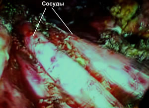 Ложе удаленной почки. Видны околенные сосуды брюшной полости