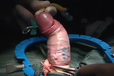 Проводится наполнение тел полового члена стерильным физиологическим