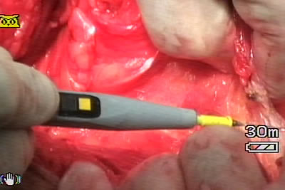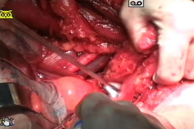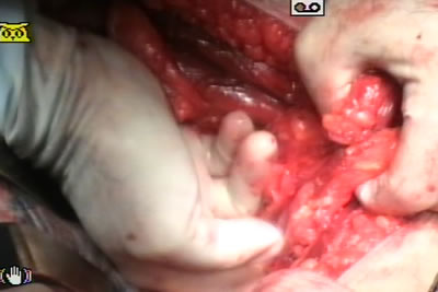 В руках оператора частично выделенный мочевой пузырь. Видны