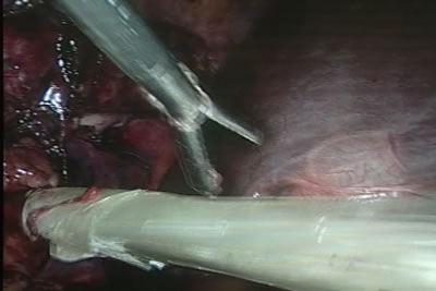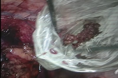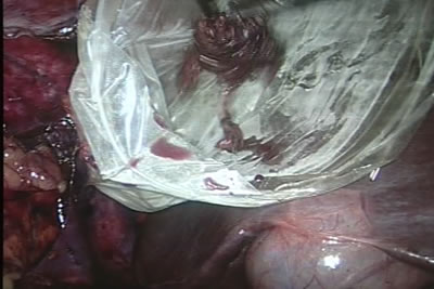 В брюшную полость введен пластиковый пакет для удаления